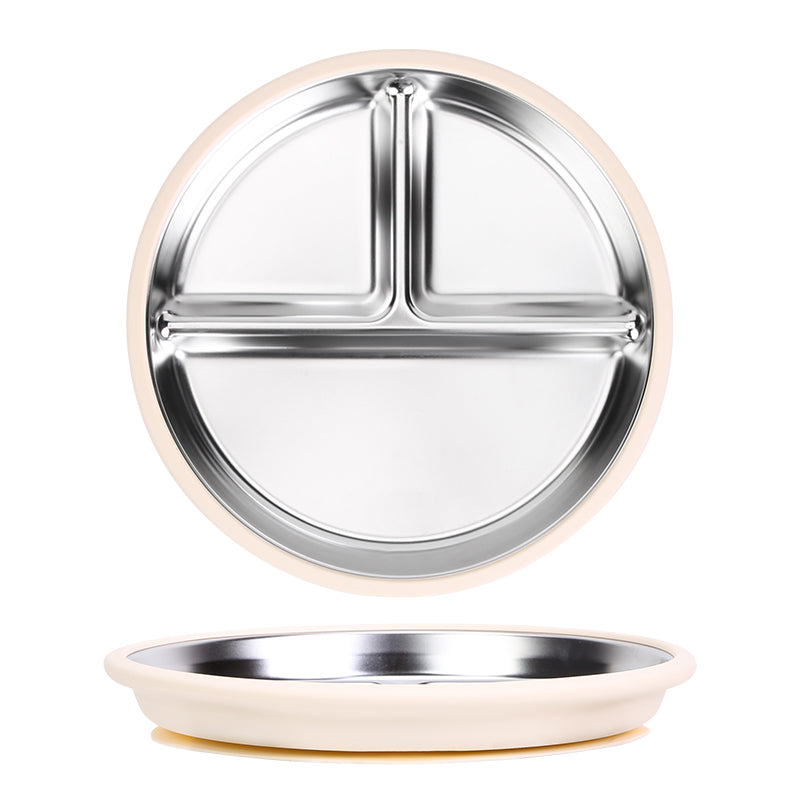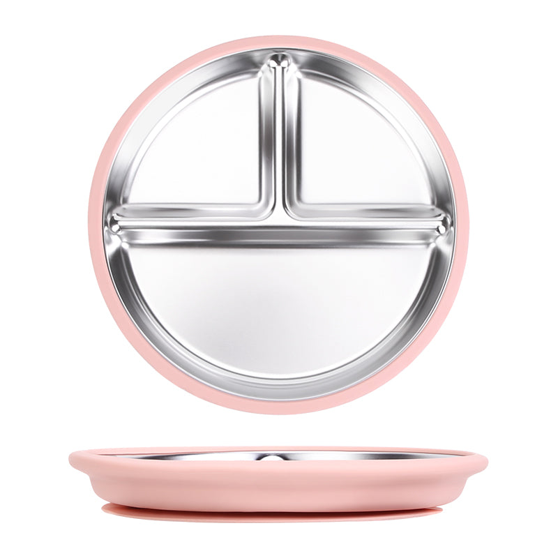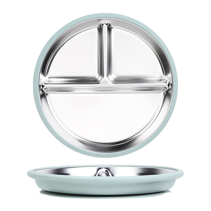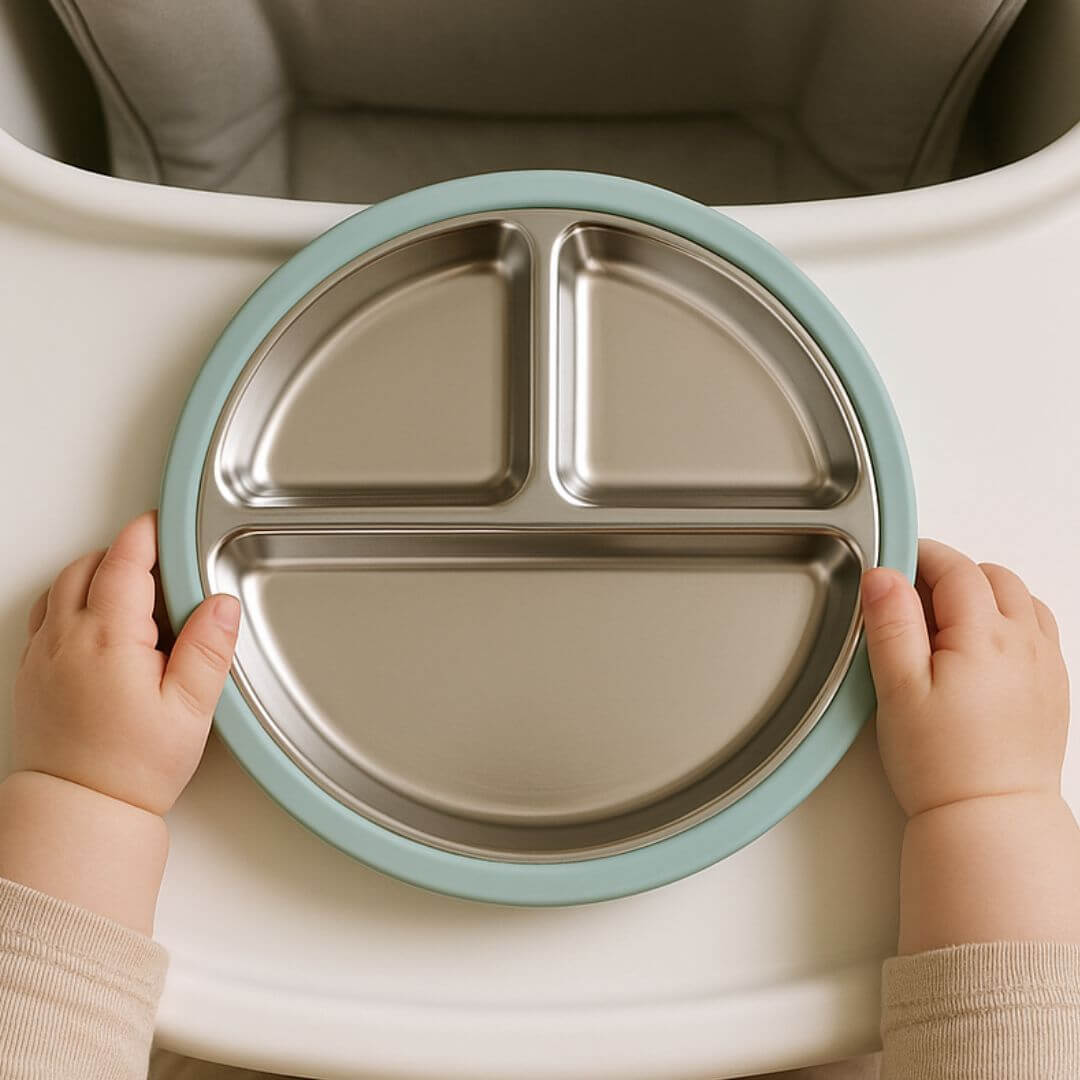 Plato infantil con 3 compartimentos, ideal para la alimentación complementaria. Hecho de Silicona de grado alimenticio y Acero inoxidable 304, un material seguro, duradero y comúnmente utilizado en utensilios de cocina por su alta resistencia a la corrosión. Es seguro, resistente y fácil de limpiar. La base de silicona es antideslizante y removible, lo que brinda estabilidad durante las comidas y facilita el lavado. Perfecto para que tu bebé aprenda a comer solito.